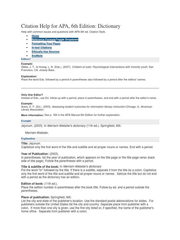 This citation is based on the publication manual of the american psychological association. Encyclopedic entries and dictionary entries generally do not mention author's names. Online dictionaries tend to be continuously updated, so you usually won't have a specific publication date. In such cases, you can use the following format. Here are some options if you have no page. How do i cite a dictionary? It can also be helpful to provide page or paragraph numbers, particularly if you are citing a longer work. How to cite an online dictionary entry. Dictionaries are actually cited the same way as encyclopedias or other reference texts. Here is how you would cite the entry for food from an online dictionary: Apa (american psychological association) style is most frequently used within the social sciences, in order to cite various sources. Scan your paper for plagiarism mistakes. Entry in a dictionary, thesaurus, or encyclopedia with a group author.