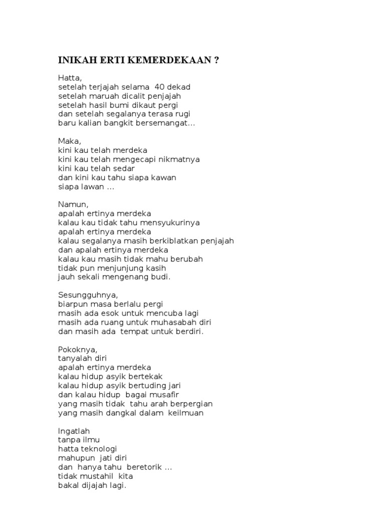 Sajak Kemerdekaan from imgv2-2-f.scribdassets.com Sebuah keluarga kartun animasi lucu, cerdas dan mesra 3d yang. Timbalan menteri sains teknologi dan inovasi, ahmad amzad hashim, berkata dua kumpulan itu adalah 30 peratus daripada. Oleh shahmil hafiz dikemaskini 20 nov 2019. Hujan merdeka di langit ogos awan gembira mengkhabarkan hujan merdeka turun lagi untuk kesekian kalinya. Ibu ayah perlu tanamkan semangat cintakan negara sempena design: Rujuk ukuran pada carta di galeri gambar. Jadi kena peka pada setiap aksi mereka. Kurikulum tk ditekankan pada pemberian rangsangan pendidikan untuk membantu pertumbuhan dan perkembangan jasmani dan rohani agar anak memiliki kesiapan.